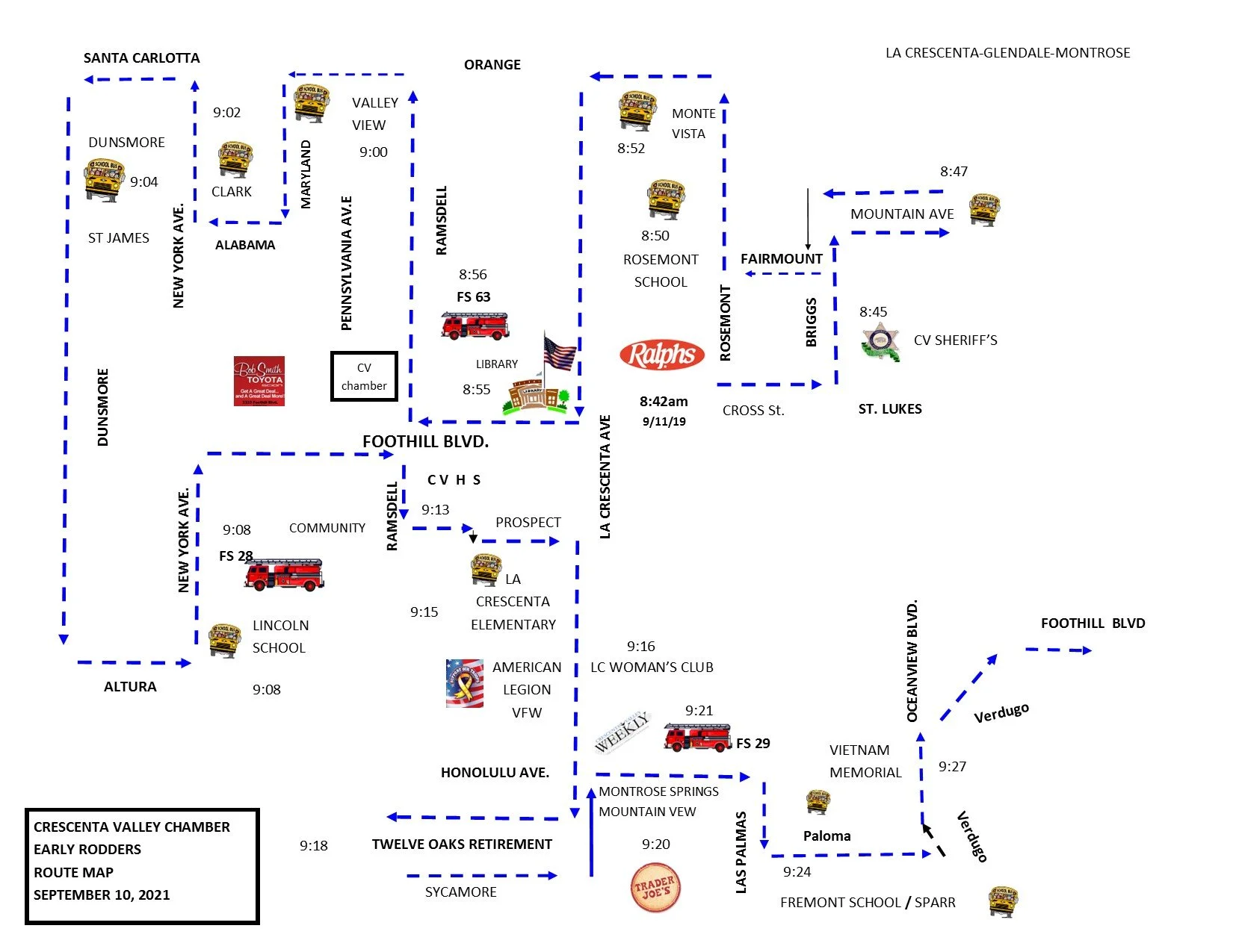 This annual Remembrance Motorcade is sponsored by the Crescenta Valley Chamber of Commerce and Early Rodders Car Club. Even though there will be no schools with their students outside waving their flags this year, and no special ceremony that evening, the Remembrance Motorcade honoring those 1st Responders who sacrificed their lives that day to save others, and also a remembrance of passengers and crew members of American Flights 11 & 77, United Flight 93 & 175, will still take place.